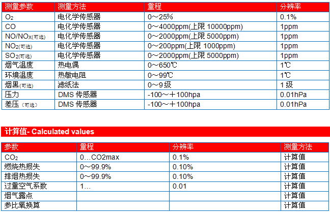 CO2, CO(U) , 燃燒效率 (0-120%), 熱損失, 過(guò)量空氣系數(shù),煙氣露點(diǎn), mg/kWh, mg/m3, 參比氧換算等
